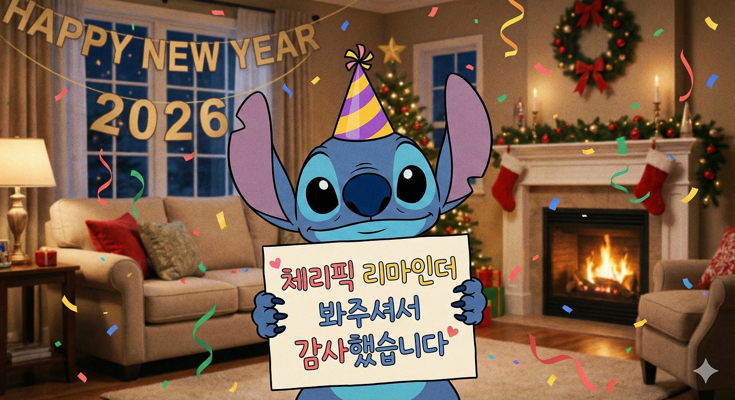 신년에도 이를 연료로 삼아 조금 더 예측 가능한 일정과 정돈된 글들, 더 알찬 소식들로 찾아뵐 수 있도록 노력하겠습니다. 잦은 휴재와 들쭉날쭉 퀄리티로 가득했던 2025 체리픽 리마인더, 읽어주셔서 감사했습니다 😚